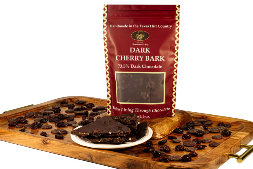Indulge in this sophisticated snack! Our Dark Chocolate Cherry Bark features decadent dark chocolate, tart dried cherries, toffee bits, and a hint of vanilla. Handcrafted in our Tasting Room & Chocolate Shop in the Texas Hill Country.